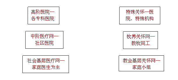 基于中国目前教会及政治的现况与氛围,我个人主张以最后一种,即以牧养关怀导向的家庭小组,来建构一个教会的关怀网,可以达到最佳的人力资源运用及关怀效果。因为过去传统的牧养方式,每个传道人得面对数以百计的羊群,往往疲于奔命。传道人好像是”牧羊犬”,而不是”牧羊人”了。这种以家庭小组所建立的关怀网,与西方国家普遍采用的”医疗网络”很相似,如下图: